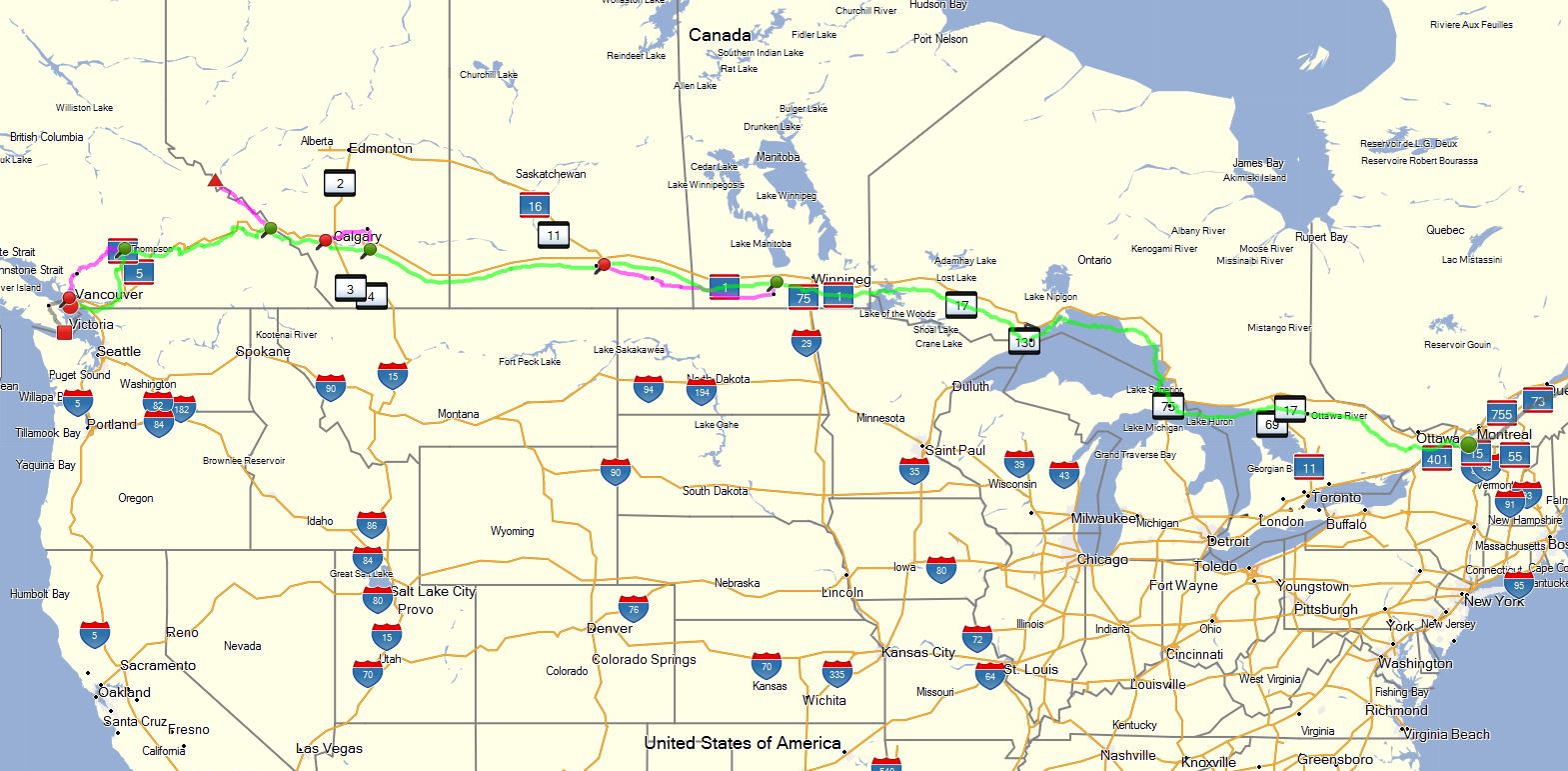 We drove from Montreal (green marker) to Vancouver (red marker)A few sections we departed from the TCH shown in magenta on the map below..